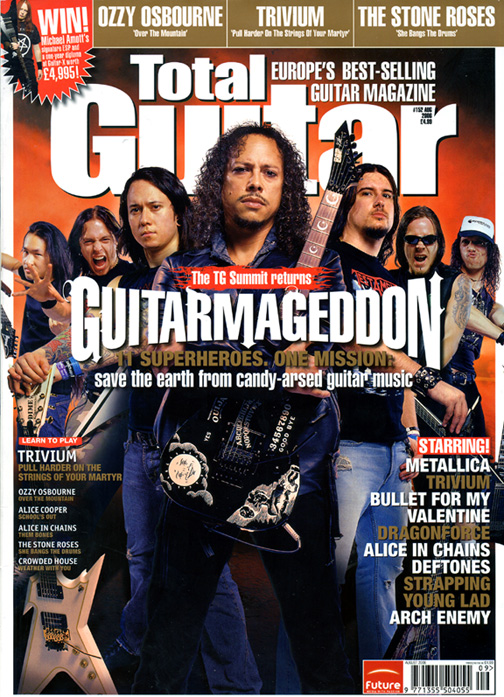The latest Total Guitar is out now with the cover shoot at Download 2006. It looks ace. Kirk looks wicked with the Ouija guitar. Brad and Chris Stocker did an excellent job putting this together.