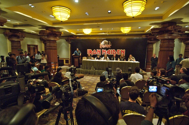 Maiden have touched down in India! Took the band to the Bull temple for a photo shoot which went great – despite the heat, the traffic, the cows in the road and British Crappy Airways leaving half my camera gear in London! The show is later today and if yesterdays reception outside the hotels and press conference is anything to go by then tonight is going to be crazy! The band had to be escorted through the kitchens of the hotel to get a quick getaway!