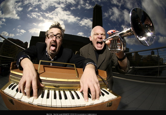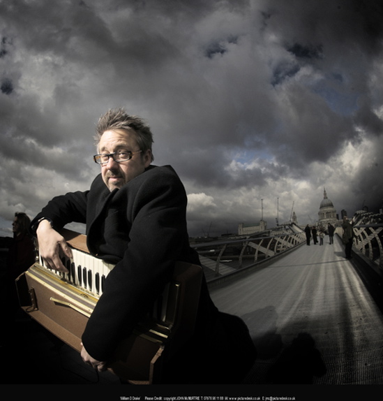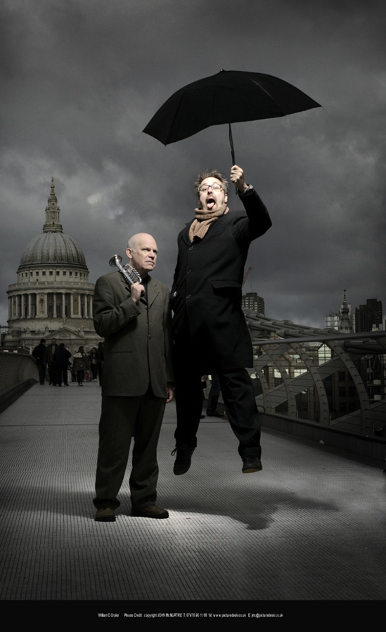 Here is Mr William D Drake photographed on the Millenium Bridge, London. It was one of those shoots when you think it isn’t going to work for various reasons but came together beautifully. The main problem was the weather, followed by more people on the bridge on a Sunday morning than expected. William was the original keyboard player from the Cardiacs a band above anything else. He is a true English eccentric respected for his solo work and an entertaining character to photograph. I fitted a flash head within my silver lined photo brolly and triggered the flash via a pocket wizard radio slave. Terry the trumpet player is holding a £3.99 toy trumpet because he was off to see Chelsea play at home after the shoot. Sometimes I love shooting in London – where else can you get a sky to look so grey?